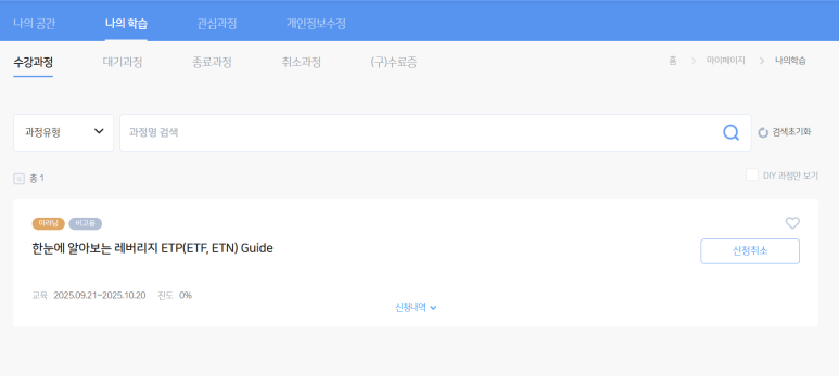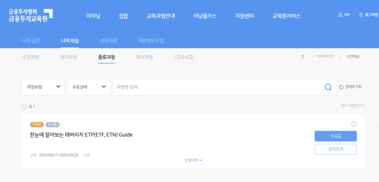 한눈에 알아보는 레버리지 ETP 수강에 대한 수료증을