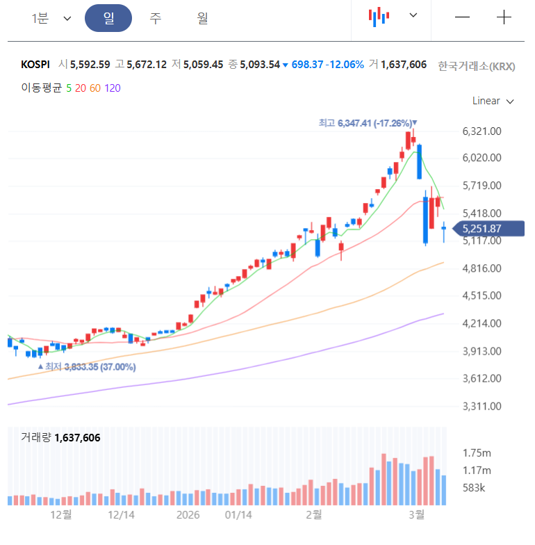 | 3/3, 코스피 7% 이상 급락하며 3/4, 12% 급락!!! 대부분의 종목이 하락합니다. (0) | 2026.03.06 |